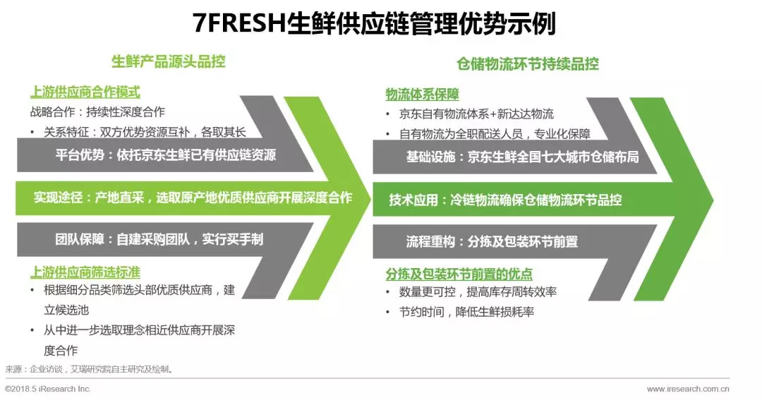 就品控而言,7FRESH从源头采购到仓储物流环节均采取了多项有效措施,确保生鲜产品的高品质呈现。首先是源头品控,通过与原产地优质供应商进行深度合作,实现产地直采,减少经销环节带来的成本加价与产品损耗,保障生鲜产品的原料新鲜;其次,通过借助京东生鲜既有的仓储物流与冷链技术应用,在仓储物流环节持续保鲜;此外,通过将分拣、包装、处理环节前置,进一步降低生鲜产品损耗。