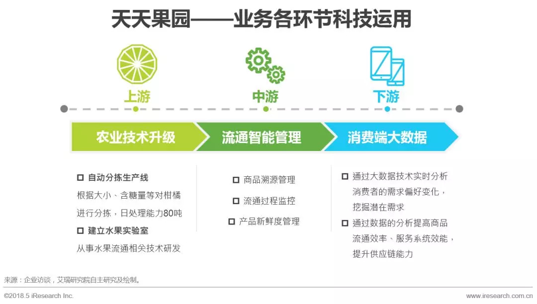 此外,为确保高效的经营效率与良好的用户体验,天天果园对于科技与研发能力持续投入,以实现业务链条各环节的数字化全覆盖。在生产流通上游,通过自动分拣生产线的应用与水果实验室的建立,强化生产流通环节品控;在流通环节中游,通过产品溯源、流通状态追踪以及产品新鲜度管理的综合运用,提升产品流通环节的信息化程度,进一步强化品控与流通效率;在商品销售环节,通过对交易数据实时分析,精确刻画消费者需求偏好变化,并为潜在需求挖掘与精准营销提供支持。