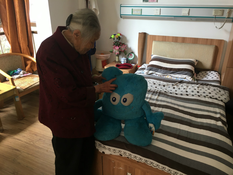 听闻记者来自上海,冯桂英拉着记者的手,指了指摆在床头的一个“海宝”的毛绒玩具告诉记者:“这就是当时上海的领导们给我发的,我一个住了30多年养老院的人,这是我形影不离的小伙伴了。”