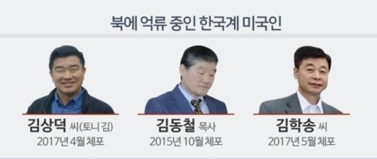 这三名美国男子分别是金尚德(Tony Kim, 美国名托尼·金)、金学松(Kim Hak-Song)和金东哲(Kim Dong-Chul),他们在2015年至2017年之间被关押,并被指控参与间谍活动或涉嫌从事反朝敌视行为。