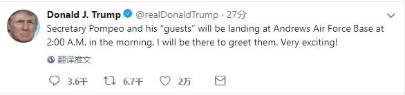 期间特朗普发推文称,蓬佩奥和他的“客人”将于美东时间10日凌晨2时抵达马里兰州的安德鲁斯空军基地,“我会在那里迎接他们。非常激动!”