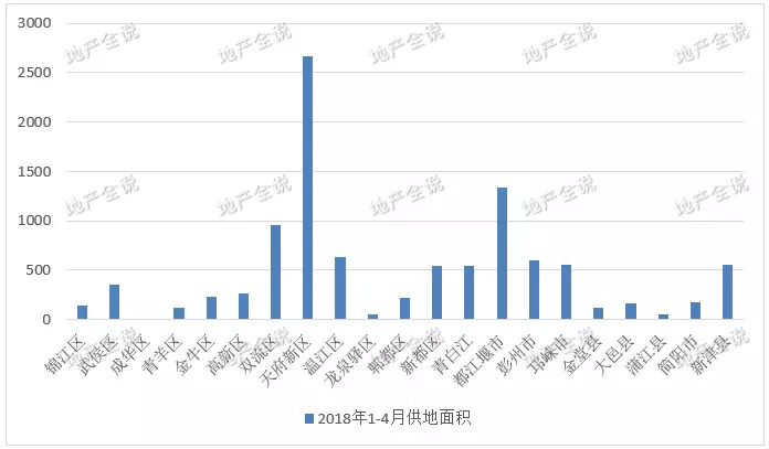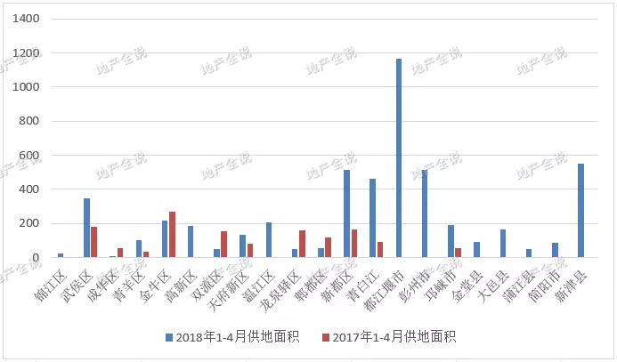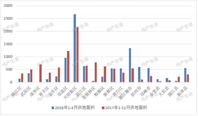 天府新区、武侯区、新都区、青白江区、都江堰区、彭州市、邛崃市、金堂县、大邑县、新津县共11个区域在2018年4个月里的土地供应面积超过2017年全年供地面积;双流和温江4个月的土地供应面积达到2017年全年供地面积的50%。