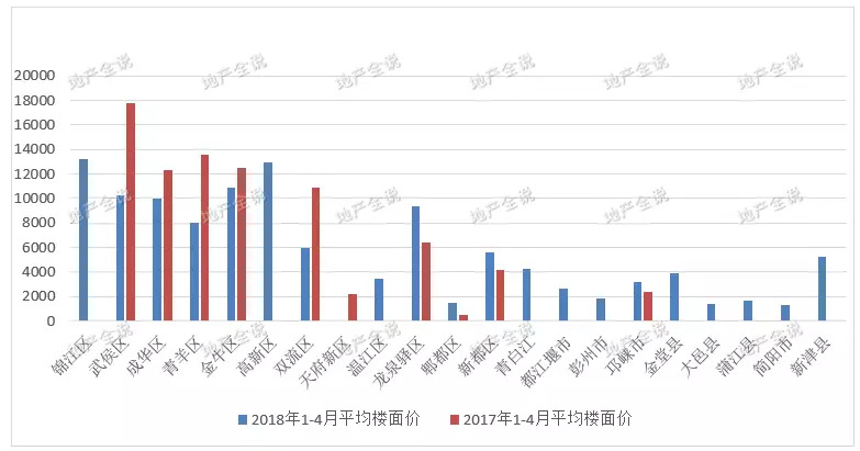 2017年和2018年前4个月大成都各区域平均楼面价对比(单位:元/平方米)