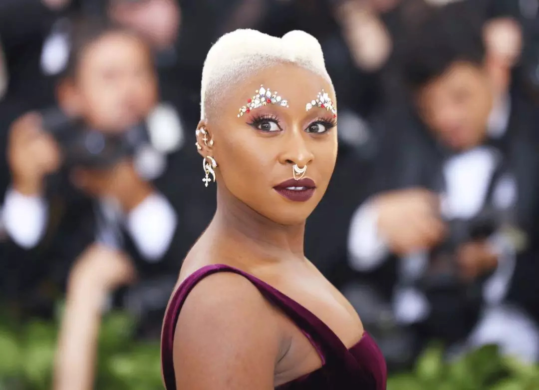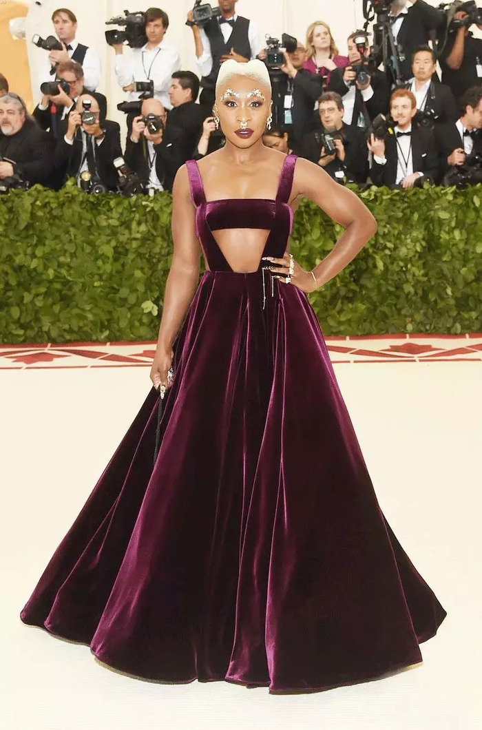 有的配饰锦上添花,有一些则是名副其实的灾难。穿着紫色丝绒绑带裙的CynthiaErivo 就像过年时绑好的腊肠,看上去香气扑鼻。