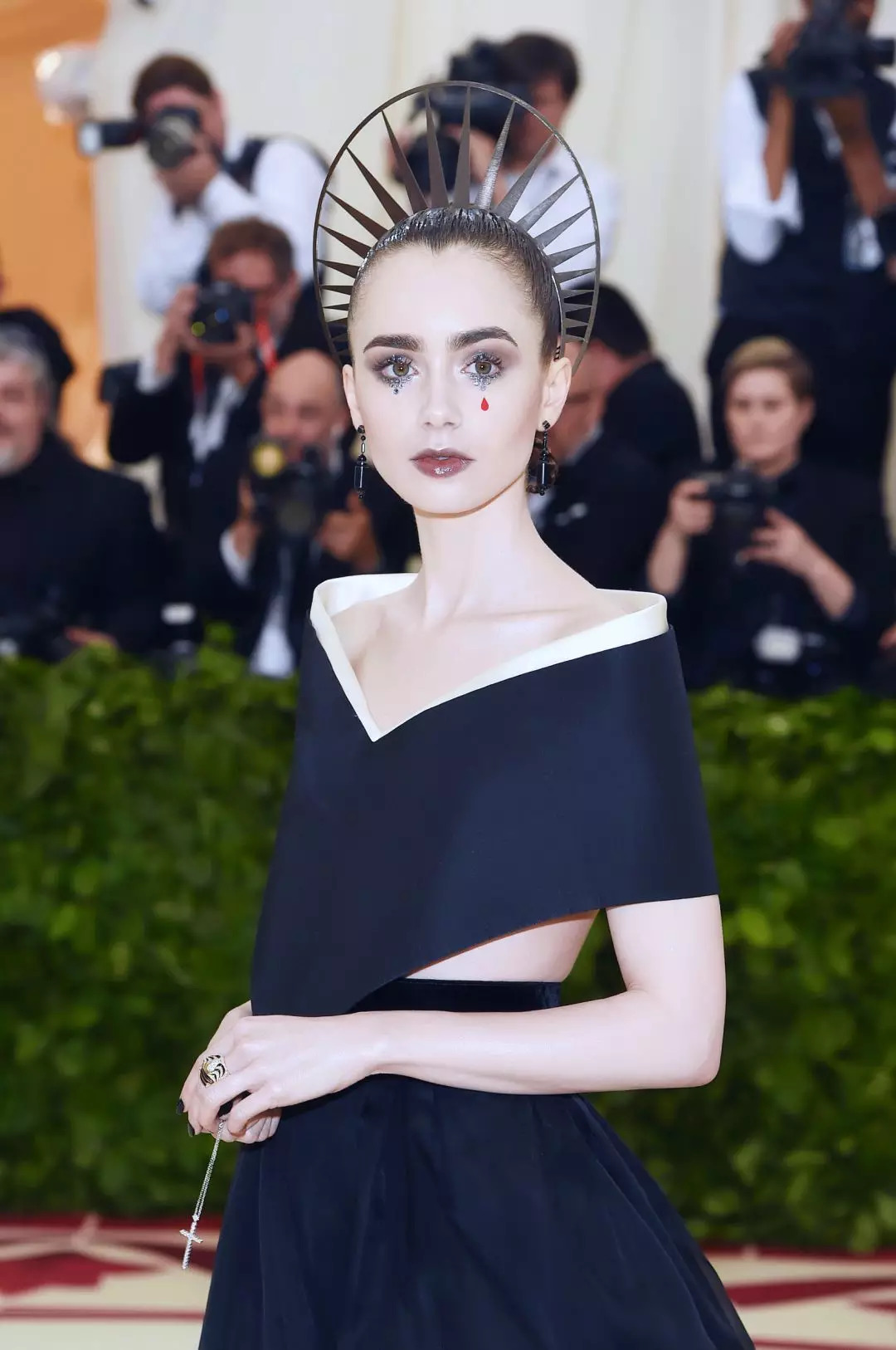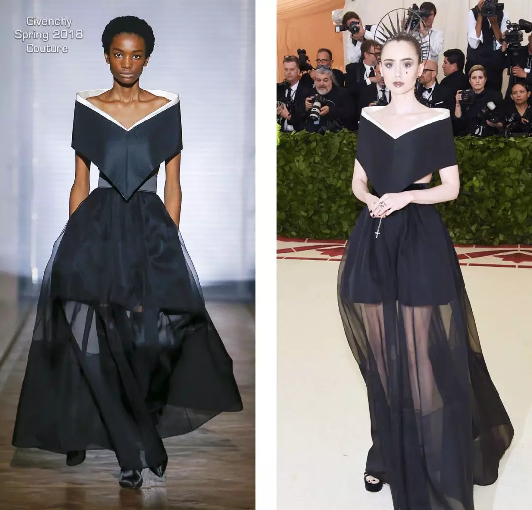 和很多人一样,造型都以苦难的圣母作为灵感,但只有穿Givenchy2018春夏高级定制系列拼接薄纱长裙的Lily Collins是真公主。