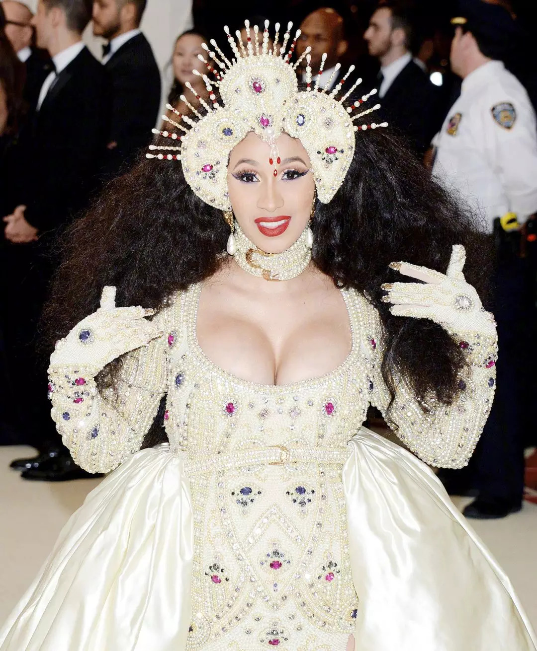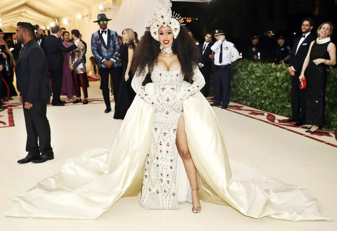 Cardi B不像kate那么小清新,只偏爱夸张的造型,穿着Moschino定制礼服的她看上去无比隆重。