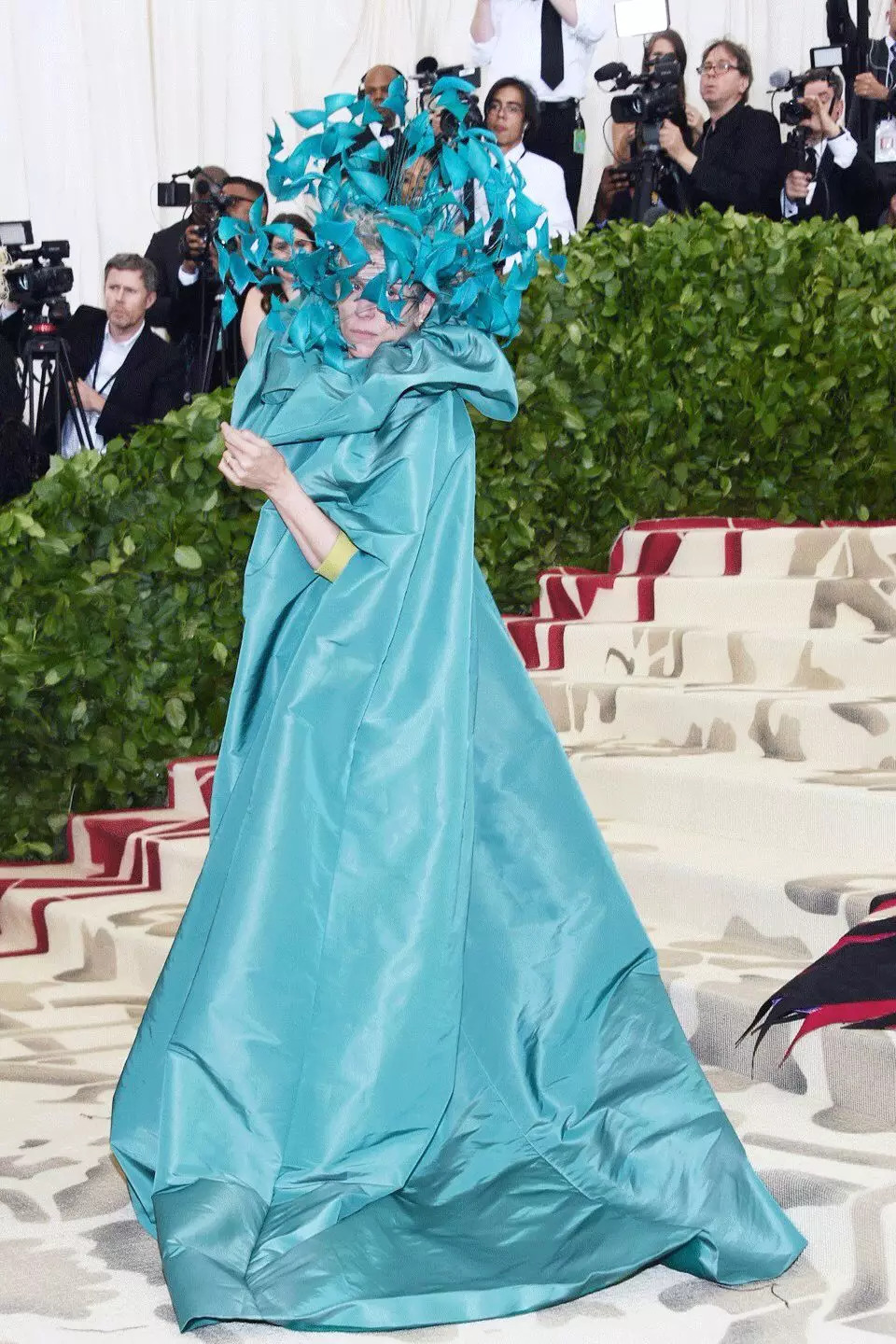 Frances McDormand是我全场觉得最有趣的人,穿Valentino最新款蓝色斗篷高定礼服和树丛头饰的她随意摆着造型。