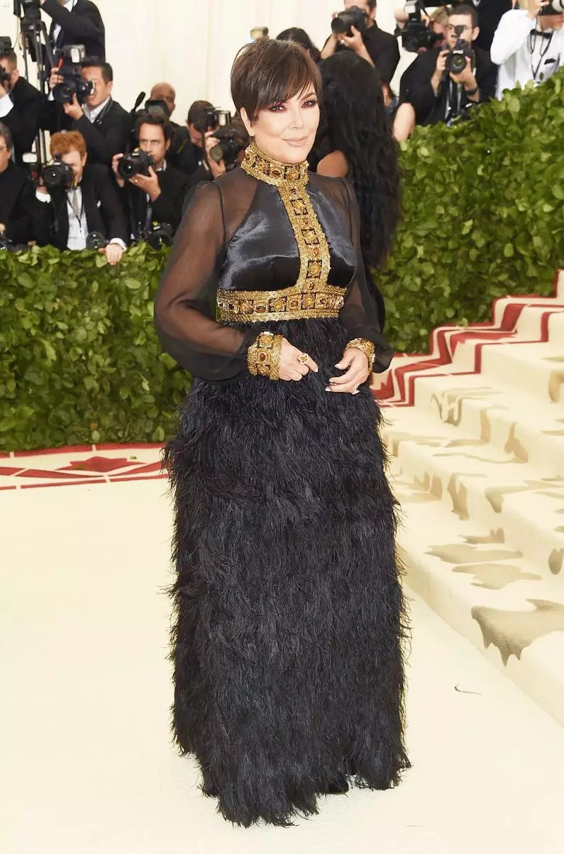 Kris Jenner穿着Tommy Hilfiger黑色拼接长裙不像来参加盛会,鸡毛掸子裙尾似乎更适合去清洁部报道。