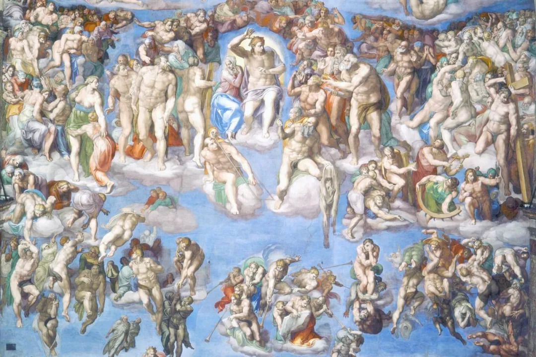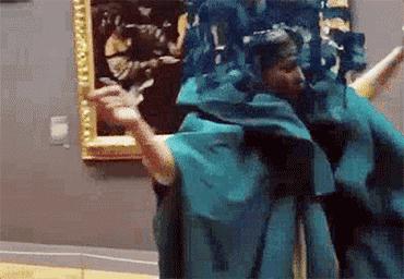 谁说天主教主题就一定要打扮成修女圣母教皇呢?她就穿了一条正常的漂亮的大裙子,用裙子上的印花点题——一整幅米开朗琪罗的《最后的审判》。