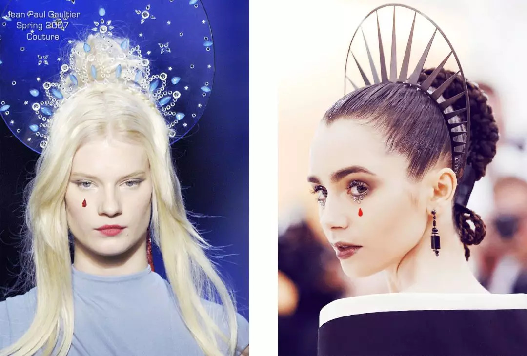 眼泪妆和唇色也完美,和Jean Paul Gaultier07年春夏秀场的妆容很像,看上去夸张又高级。