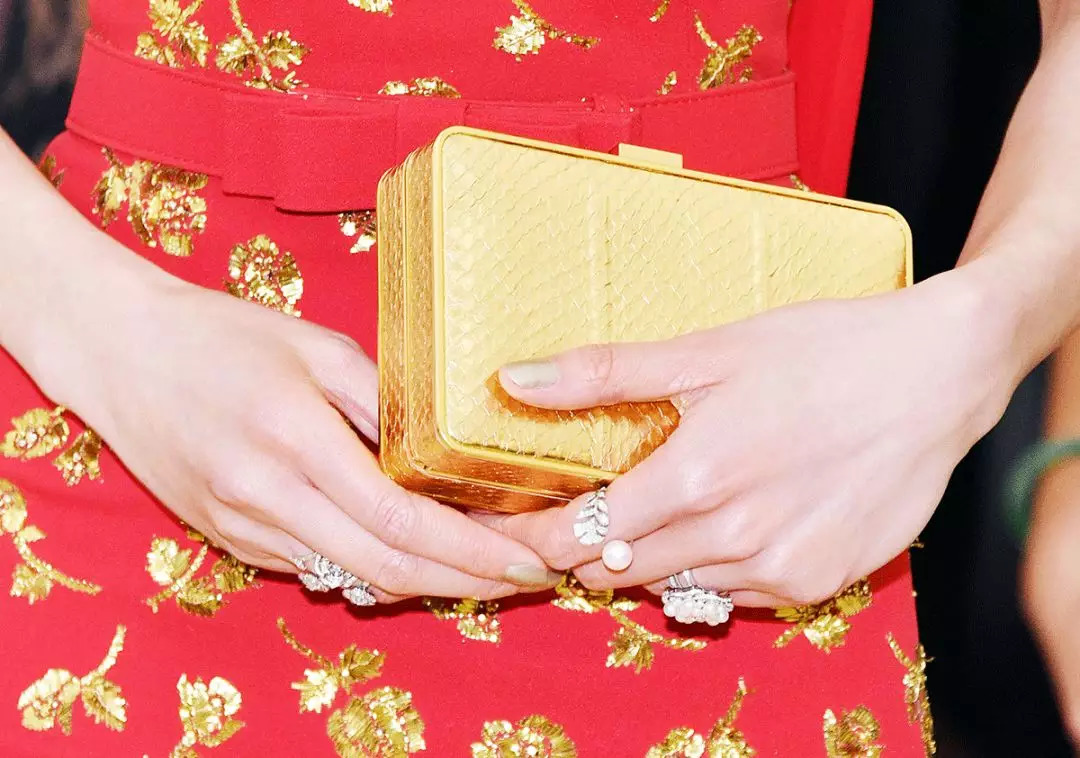 穿着Michael Kors红色印花抹胸裙的她就像尊精美的瓷器,金色的玫瑰花装饰看上去很和谐。