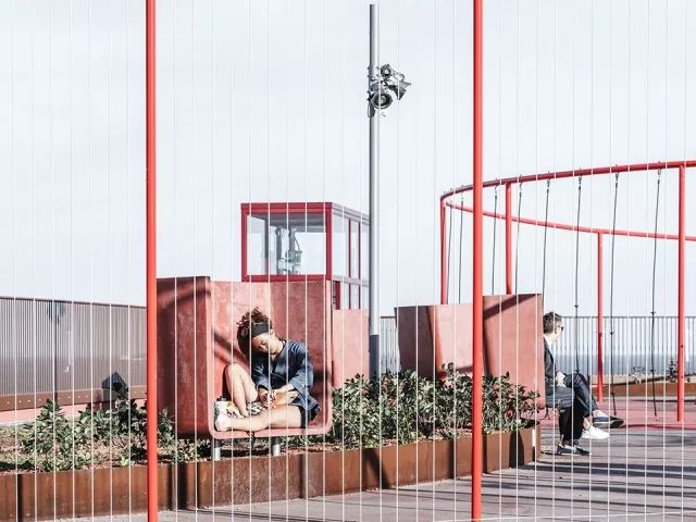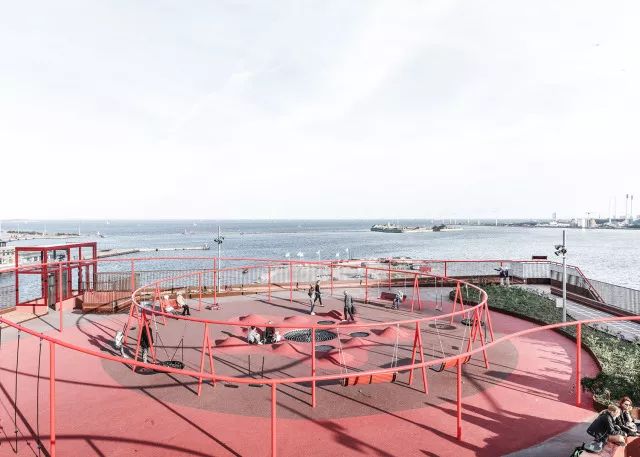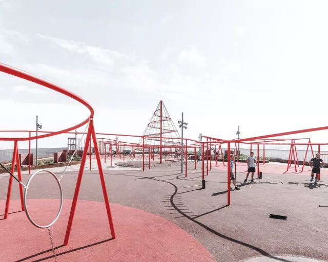 游乐场的设计延续了停车场红色的背景,人们除了可以自由选择上面的设施玩耍外,还可以选择单杠、露天瑜伽房、小型足球场和攀岩等项目。充分地证明了充满活力的城市空间对人们生活品质的提升。