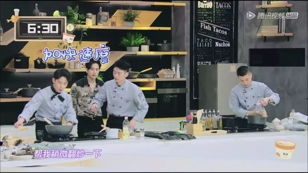 从已经播出的两期来看,在料理环节,6位厨师被分为两队。王嘉尔和当期的嘉宾的朋友将会作为队长分别带领3位厨师。在15分钟之内,两队进行PK,而两位队长负责支援、加油等。这一环节不仅增强了厨师和嘉宾的参与感,节目的紧张程度也大大加强。