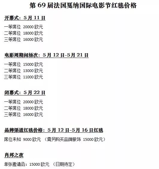 就在最近,网上又重新流传出一份参加戛纳电影节的红毯价格表。