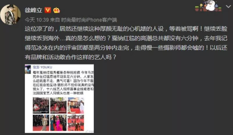比如昨天参加开幕式红毯的马苏,主办方规定了不能自拍,她硬是在红毯上停留了6分钟之久。