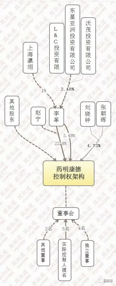 药明康德无控股股东,Ge Li(李革)及 NingZhao(赵宁)(两人为夫妻关系)、刘晓钟、张朝晖四人为公司创始人,共同控制公司上市后共31%的表决权。