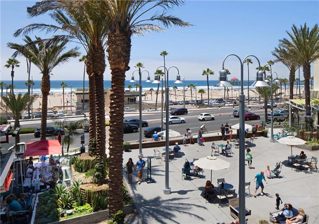 如同它的名字一样,太平洋城这个项目是真正面对着海域,地理位置绝佳,绿树、沙滩、海洋是天然的视觉打造。它位于洛杉矶Huntington Beach,坐落的这个区域有两个显著的客群特点,首先,这里是富人集中的区域,辖区内34%家庭年收入超过10万美金;其次,这里也是冲浪爱好者的天堂,周边25%人口有冲浪运动爱好。住宅部分就在商业部分的身后,还同时连接一间五星级君悦酒店。