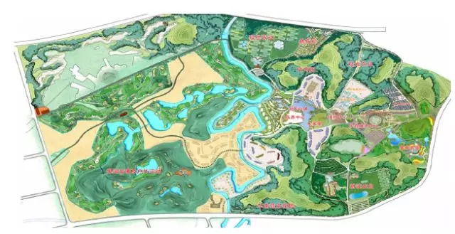 “六区”,即入口景观区、田园风貌区、壮乡风情区、桃源文化景观区、乐动文化景观区、养生康复文化景观区;