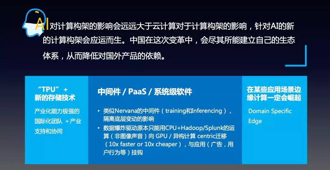 杨磊认为,谈到芯片发展要先谈计算构架的变革,曾经的计算构架主要依托于intel,同以往不同,现在的芯片底层变了,已经从CPU变成了GPU,就像多米诺骨牌一样,当底层基石改变后,一连串关联技术都会变化。芯片一部分是做处理一部分是做存储。对于常人计算和存储是二合一的,很多人认为做一个跟谷歌类似的TPU就可以,但目前看认为不是这样。底层芯片未来机遇既不是CPU也不是GPU也不是TPU,也可能是另外一种构架,这样性能会有10-100倍提升。