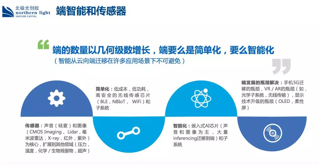 端的两极分化会进一步加剧,一类变的简单,一类变得智能。在声音和图像两大领域,北极光有一些布局。简单化指的是简单的链接和存储已足够,模组方面未来都可以在一个芯片上完成,包括通讯、存储和计算功能,成本都会变的非常低,传感器在这方面就很有价值。云、边缘、端智能,北极光做了全局思考。