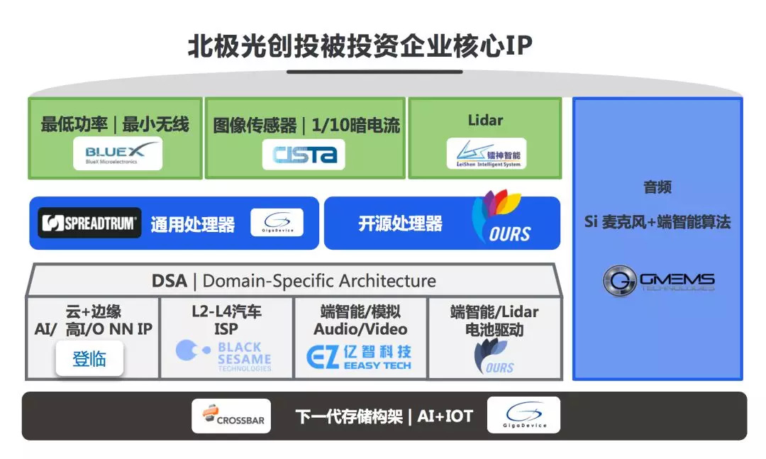 在AI相关芯片方向,北极光投资的核心IP目前包括:专注于 IoT无线射频的 BlueX,专注传感器的Cista、镭神智能,专注处理器的 Spreadtrum、OURS,专注 DSA(Domain Specific Architecture)的登临、黑芝麻智能科技、亿智科技等,专注存储的Crossbar以及专注音频前端处理的 GMEMS。