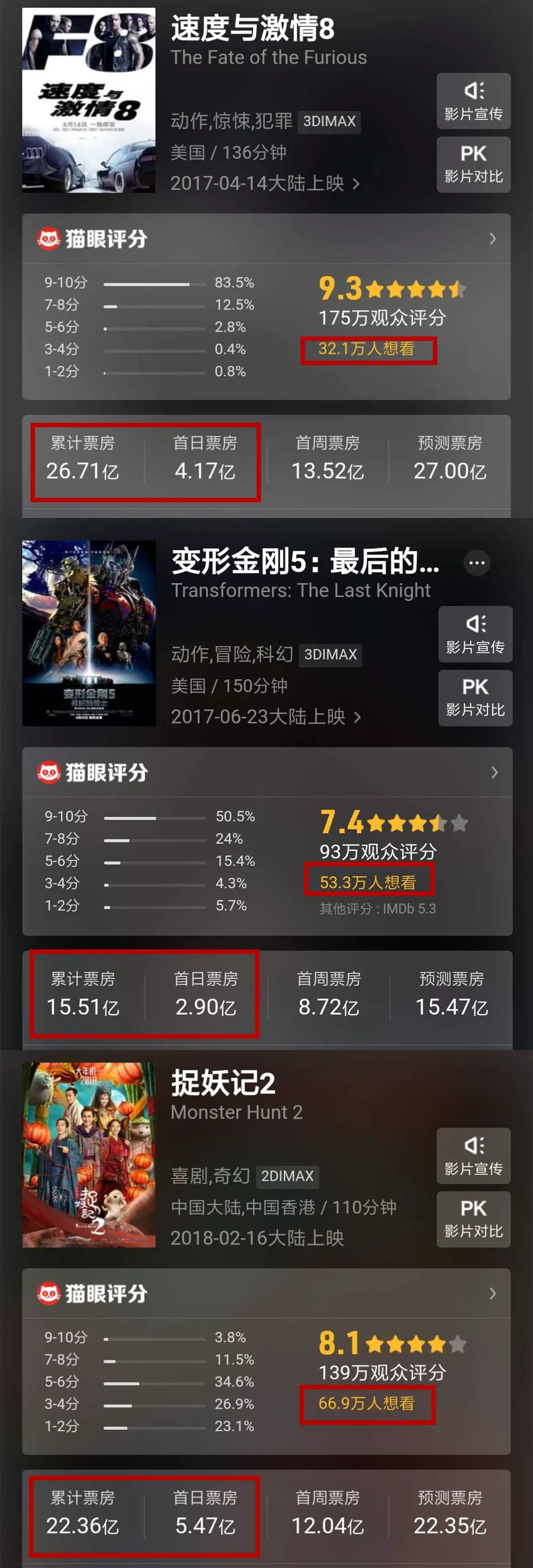 1.想看与预售:猫眼想看当时历史第一,预售与《速度与激情8》为同一量级