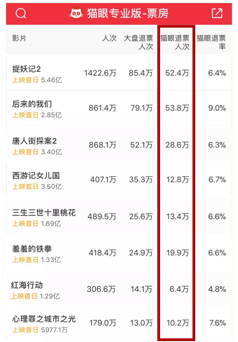 这4部影片,并不全都是首日票房高、总票房高或者整体热度高的影片,但却产生了名列前茅的退票数量,而在猫眼的退票率最低的也有6.6%。