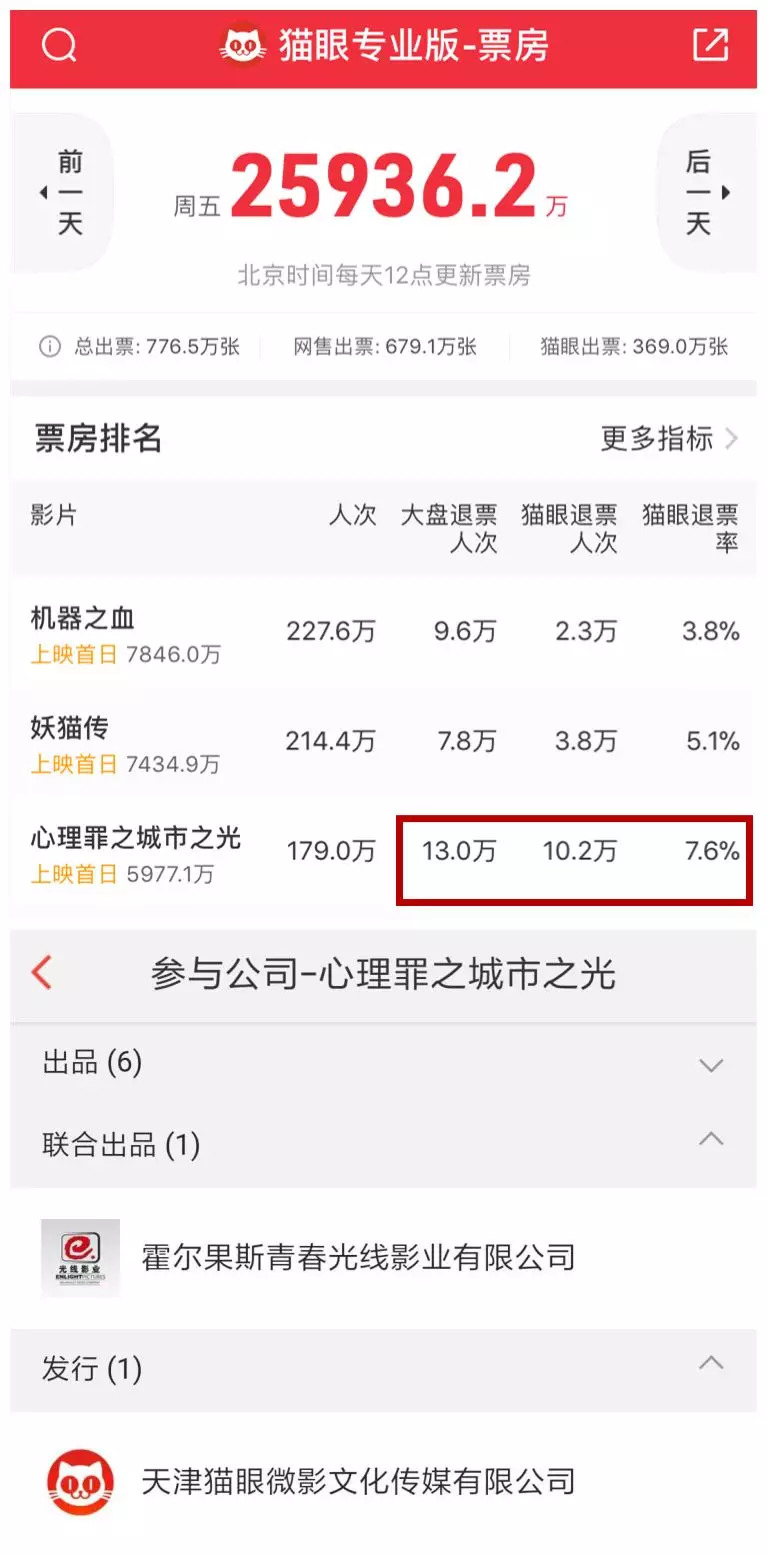 在数据复盘中,我们发现《心理罪之城市之光》与《后来的我们》有点类似,也有着超高的营销指数与改签率,虽然上映首日票房只在当日第三名,但是其在猫眼上10.2万的退票人次却为《机器之血》与《妖猫传》的三到四倍,退票率也达到了7.6%,而猫眼专业版显示其发行公司为猫眼。