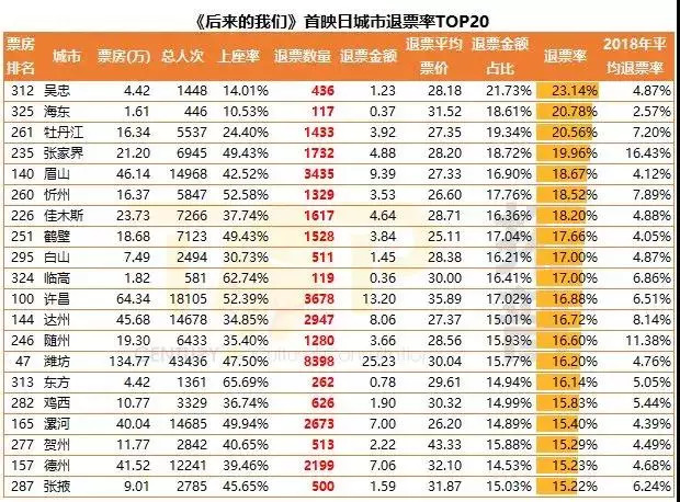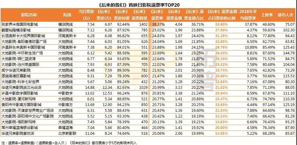 从影院角度来看,《后来的我们》影院退票率最高超过了25%,在首映日退票率前二十的影院中,大多数集中在主要影城在三四线城市的院线,其中大地院线旗下影院有12家,横店院线、河南奥斯卡院线各2家,中影数字、中影南方、幸福蓝海、北京新影联院线各1家,这些影城的退票率都高于20%。