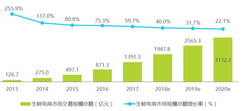 从近几年中国生鲜市场交易规模来看,2016-2017年生鲜电商市场大量中小型生鲜电商或是倒闭,或是被并购,市场遇冷。作为万亿规模的生鲜市场,线上的占比依旧非常小。