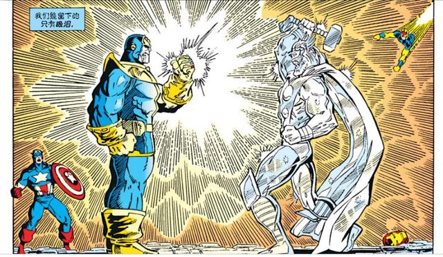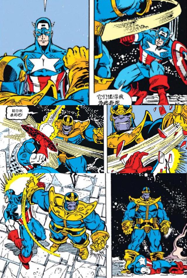 这里美队无论是“主攻下三路”的套路,还是三两招之后被灭霸一拳“KO”,都是对漫画《无限手套》的完美还原。