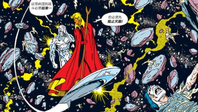 这个场景是在致敬漫画《无限手套》,灭霸发狂之后意欲毁灭整个宇宙,术士亚当与银影侠在逃命途中也遇到了类似场景。