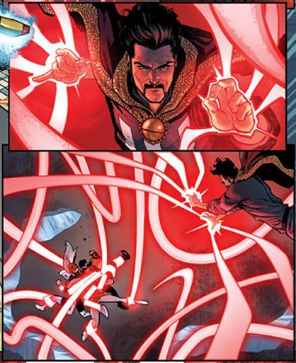 这几根系带,就是奇异博士在漫画中最常用的法术之一——赛托拉克红带(参考图如上,出自漫画《内战2》)。