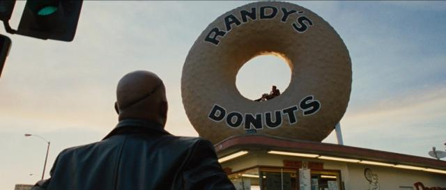 而这也不是他第一次在甜甜圈里了,早在2010年的[钢铁侠2]中,就有钢铁侠倚在巨大的甜甜圈广告牌里吃甜甜圈的场景。