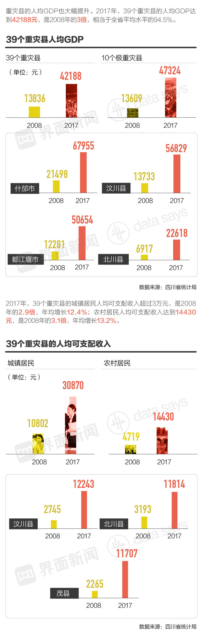 2017年,39个重灾县地区生产总值达到6829.7亿元,总量是2008年的3倍,按可比价格计算年均增长11.8%,比全省年均增速高0.8个百分点。