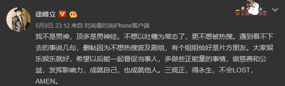 徐峰立将前述微博删除后,又发了条微博进行解释,称其不想波及剧组,更希望大家多做慈善和公益,以一句“三观正,得永生”结束了这场没有硝烟的争斗。