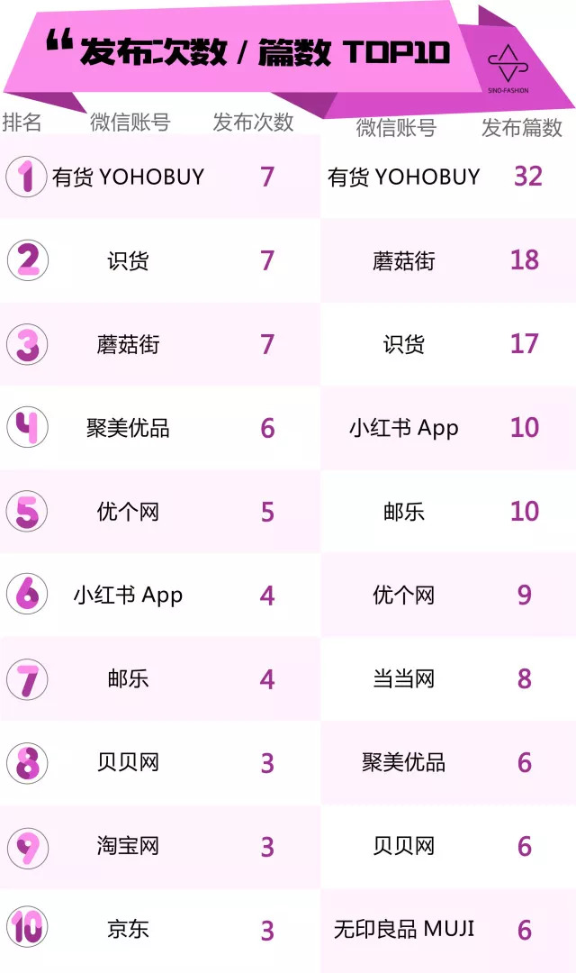 上期榜单中,天猫一周发布了10次抢占了第一名,此次不见踪影。总的来说电商公众号们积极度均有下降,35%的公众号仅推送一次,35%的公众号并没有推送文章。有货、识货、蘑菇街发布次数最多,文章最多。