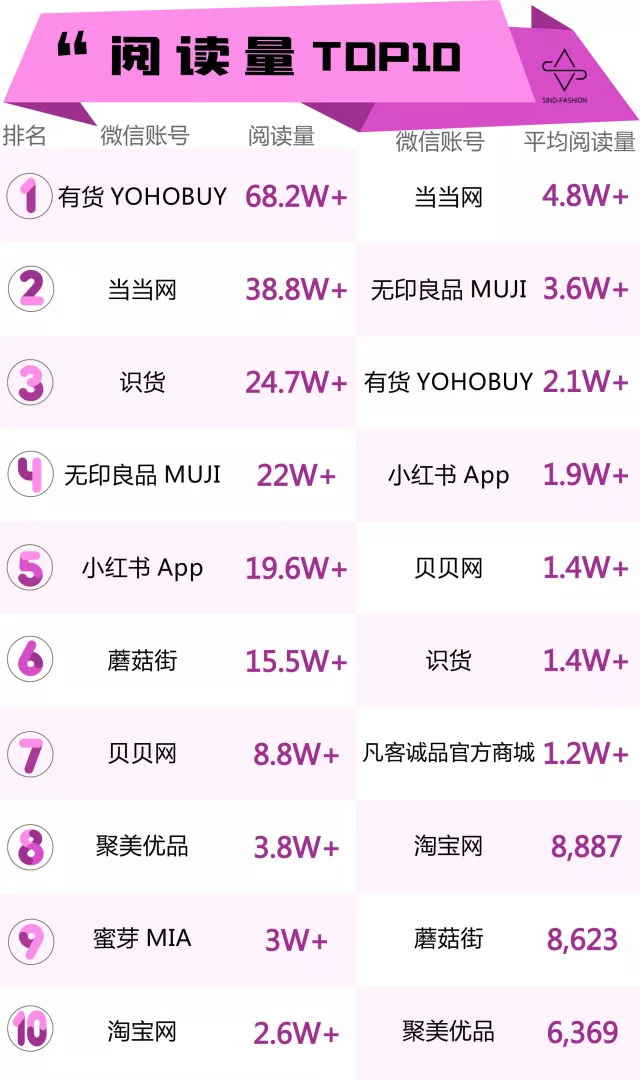 即使都在TOP10,阅读量之间相差也特别大,第1名一周阅读量达到了近68万,而第10名仅2万。当当网的平均阅读量最高,有货和和无印良品也表现不错。
