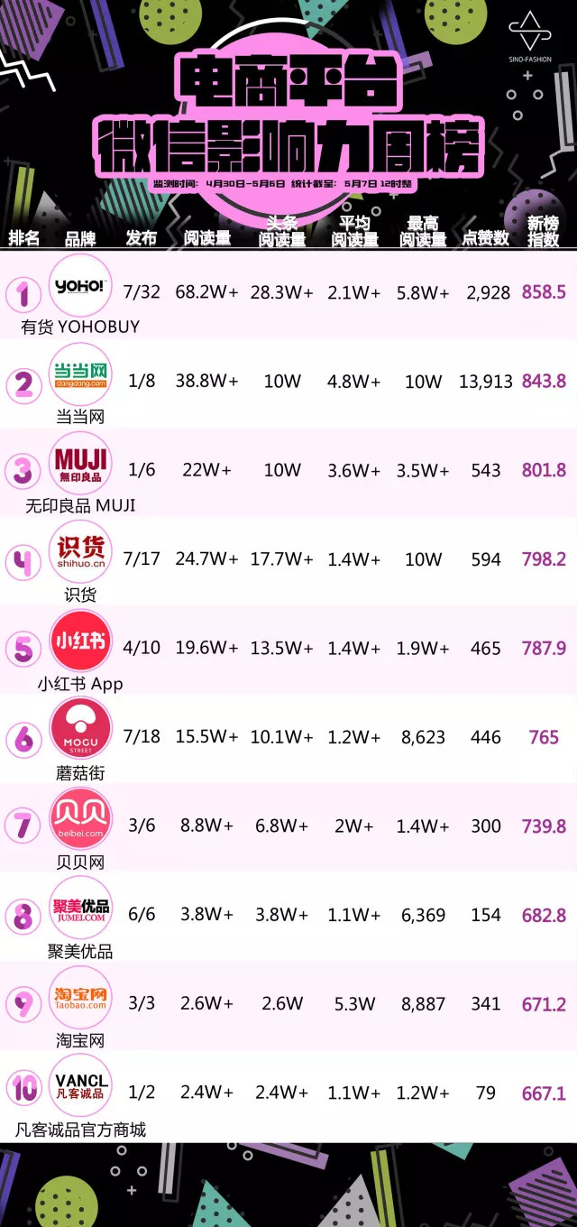 本期榜单的数据来源:中服·新榜数据库中4月30日0:00至5月6日24:00的所有电商平台微信公众号的发文。作为排名依据的新榜指数,由各电商官微的各项原始传播数据加总、取均值并标准化处理后,参照权重计算公式推导而得,数据维度包括:总阅读数、平均阅读数、最高阅读数、头条阅读数、点赞数。