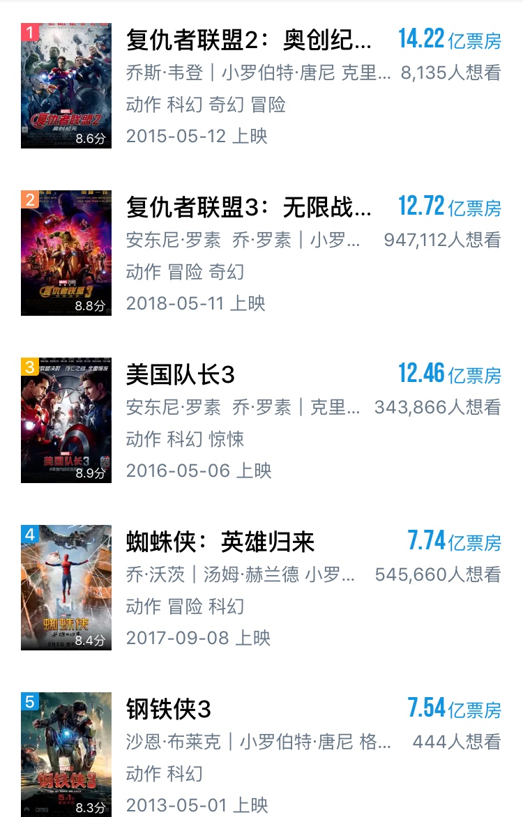 尽管现在来看漫威超级英雄电影的声势颇高,但细数之前“漫威宇宙”在国内上映的作品,从2011年的《美国队长》开始到今年年初的《黑豹》一共十四部电影中,仅有《美国队长3》与《复仇者联盟2》票房超过了10亿,即使是在中国电影票房不断高企的2015年,后者这样的全明星加大制作也不过收获了14.22亿票房,同年的《速度与激情7》则整整比它多出了10亿。