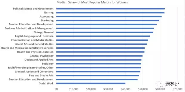 这些专业多以文科为主,且女性毕业生人数均超过或接近于男性,女性可获得的平均工资为52,800美元。女生是如何在这些专业里胜出的?让我们来看看TOP5的情况。