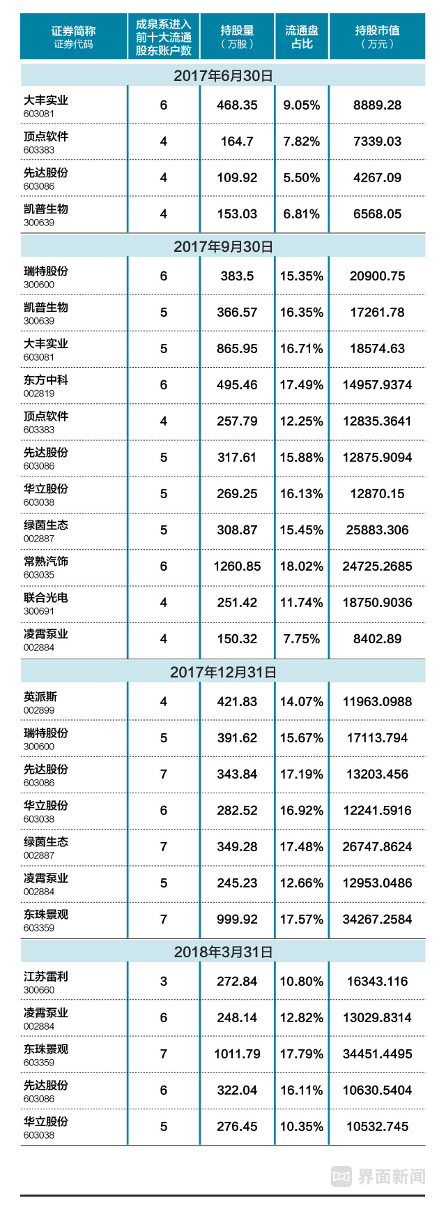 “成泉系”是指北京成泉资本管理有限公司及其旗下的私募基金产品,北京成泉是曾任中信资管执行总经理、资管业务投资总监和权益投资负责人的胡继光所创办的私募证券投资基金公司。作为中信证券首批员工创业基金所投出的首个项目,该公司首批资金来源于中信证券旗下的金石投资,但后者于2017年5月退出,目前股东主要是胡继光所领衔的王雯珺、梁雪丹等公司管理层。