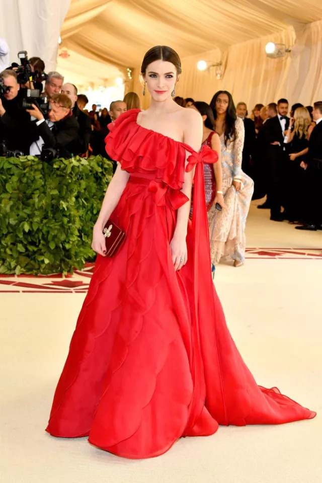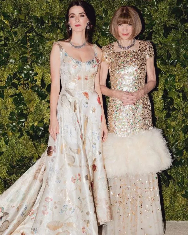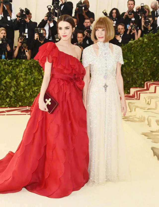 当天, Anna Wintour 与女儿 Bee Shaffer 抢先亮相红毯,Anna身着Chanel经典亮片白纱裙,女儿Bee身着Valentino露肩大红长裙。