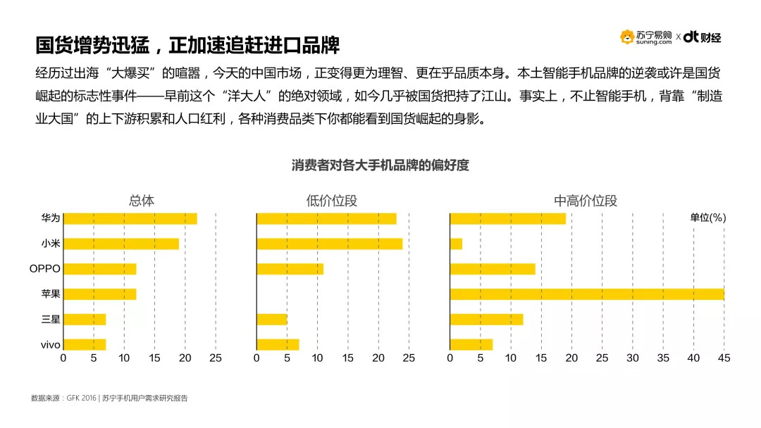 这个曾一度被苹果、三星等进口品牌把持的科技产品领域,如今已经是华为、小米、OPPO们的天下,从用户偏好度来看,添置新机时人们对国产品牌偏好度更高。