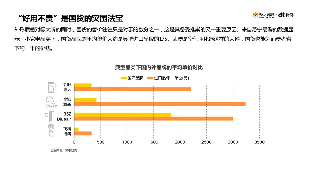 苏宁易购数据显示,小家电品类下,国货品牌的平均单价,大约是典型进口品牌的五分之一。即便是空气净化器这样的大件,国货也能为消费者省下约一半的价钱。