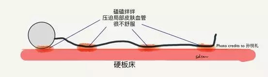 因为人的身体并不是平板一块,无论侧面、正面还是反面。当身体表面接触到较硬的床板,身上那些比较突出的部位就会像「支架」一样承担身体所有的压力,久而久之就会影响血液循环,行动不便的人长期这样卧床会引起褥疮。