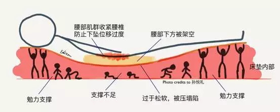 在睡觉时,无论仰卧还是侧卧,脊柱周围的肌肉都会发力以维持一定的支撑,海绵之类太软的材质,不能给身体足够的支撑,因此一觉睡醒就会有腰酸背痛的感觉。