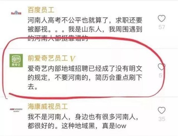 如果还仔细研究下美团版的“原则上不要黄泛区和东北人士”,以及爱奇艺版的“今后河南人尽量先过滤掉”,我们似乎还能从“原则上”和“尽量”这样的用词上感受到发话者对自己还在话术上留有余地的那点小自得。但这依然是赤裸裸的歧视。根据《就业促进法》,劳动者依法享有平等就业和自主择业的权利。劳动者就业,不因民族、种族、性别、宗教信仰等不同而受歧视。