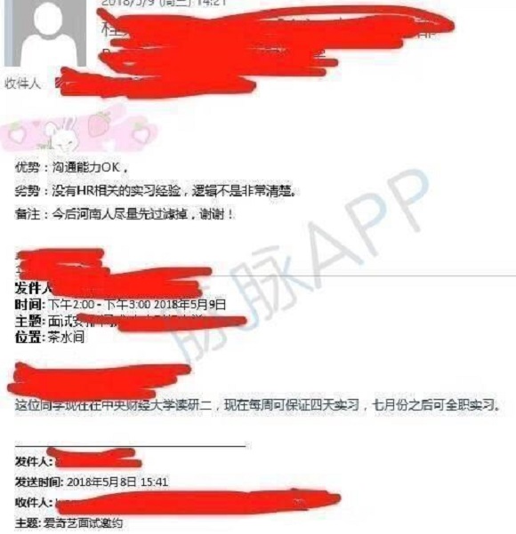 “今后河南人尽量先过滤掉”,5月9日,爱奇艺就因一名员工在招聘中的这句话而陷入风波,许多网友因此停买爱奇艺视频会员,怒卸相关APP。根据网上热传的邮件截图显示,该员工在做面试反馈时,除了简要陈述某应聘学生的优劣点,还在备注中明确表明了自己对河南籍求职者的嫌弃。