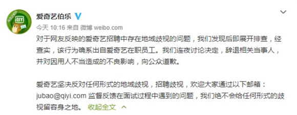 5月11日,爱奇艺通过其招聘微博号以及公司官微向公众致歉,承认存在招聘歧视问题,表示已辞退当事员工,并强调坚决反对任何形式的招聘歧视。